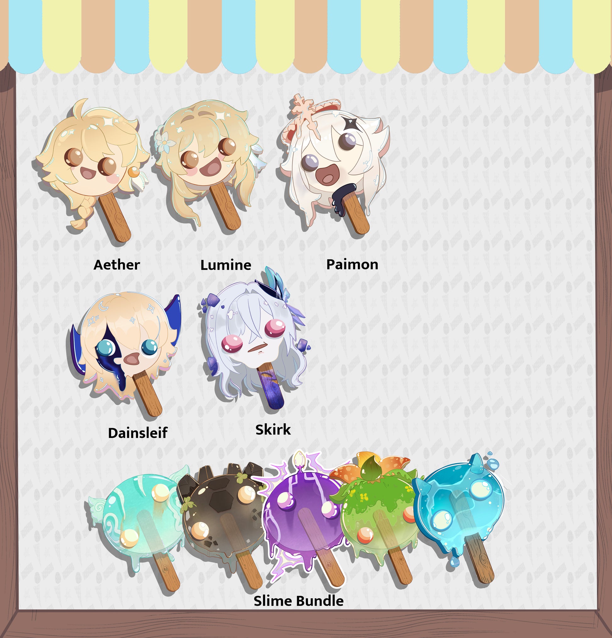 Welcome to the Teyvat Ice cream shop! I've been doing a series turning every Genshin Impact character into shitty popsicles and now you can put them on your physical body. Cover everything you own in terrible popsicle pins to show off your favorite main.
