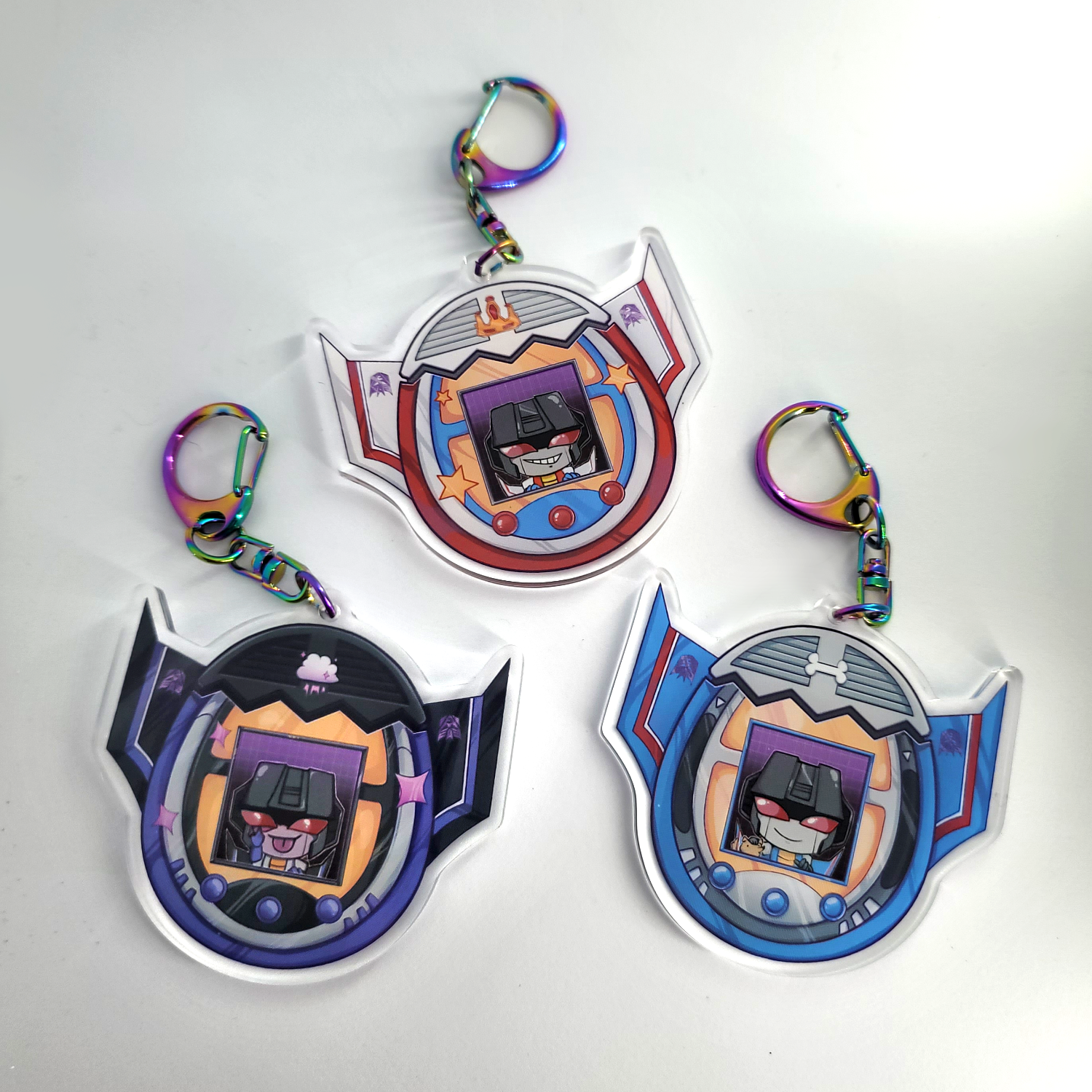 Bring home your favorite Autobots and Decepticons as egg related pets! These keychains are 2.5" double sided acrylic with chromatic clasps. Durable and ready to accompany you through out the day. With eight available characters and more on the way.